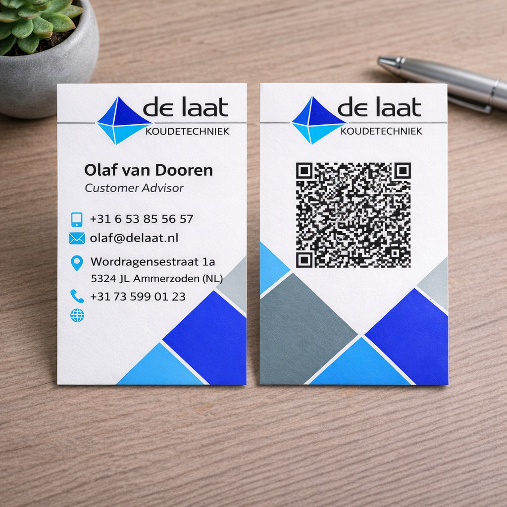De mockup is gemaakt door AI, want ik heb de geprinte versies zelf helaas niet. Maar dit is de reden dat de mockup niet helemaal klopt. De QR-code op het visitekaartje gaat rechtsreeks naar het nummer van de eigenaar van het visitekaartje.